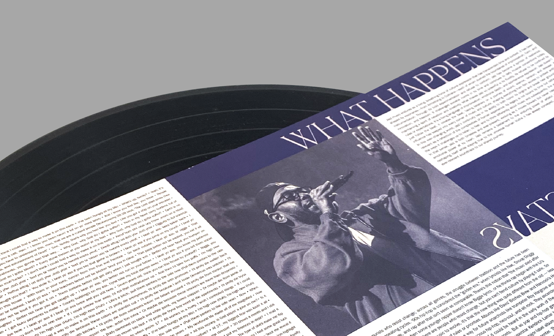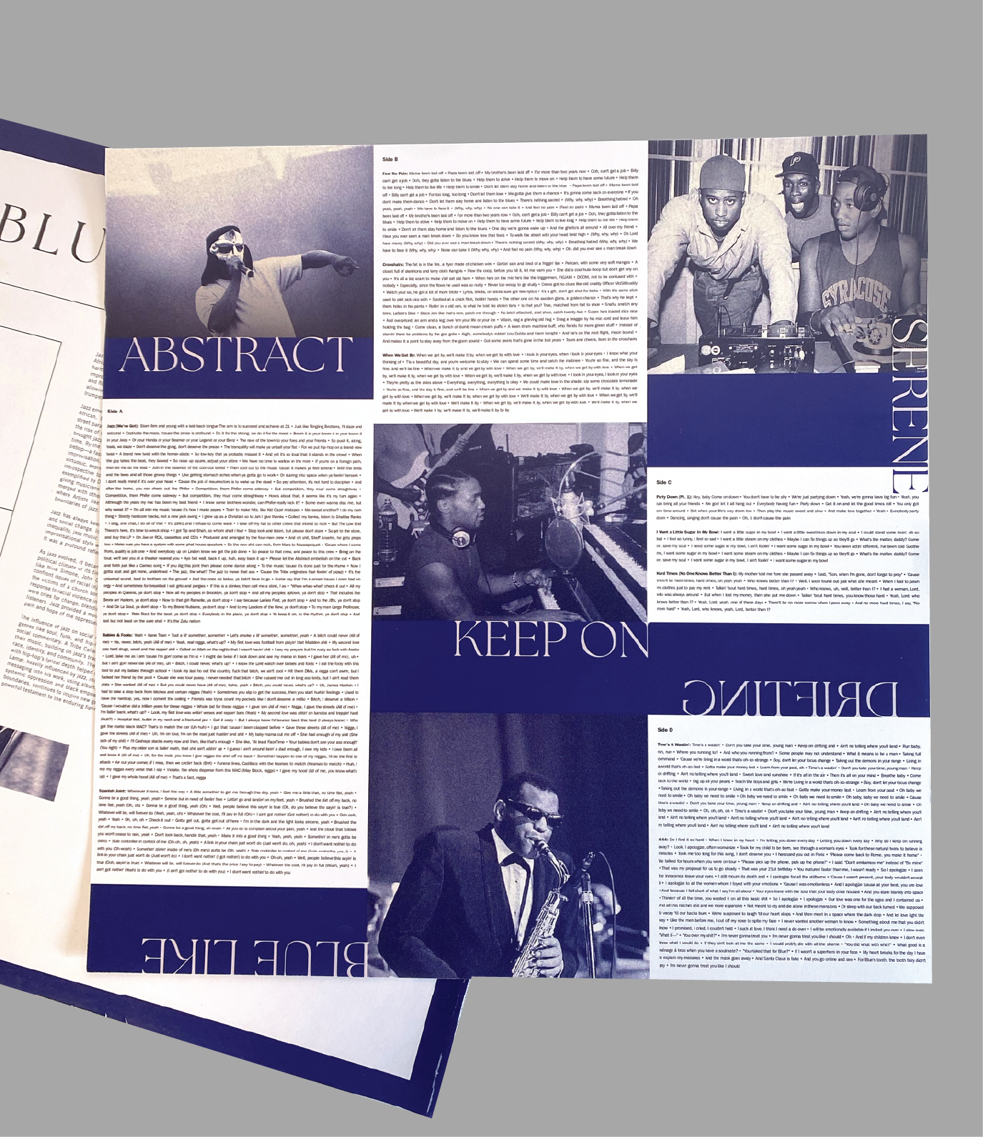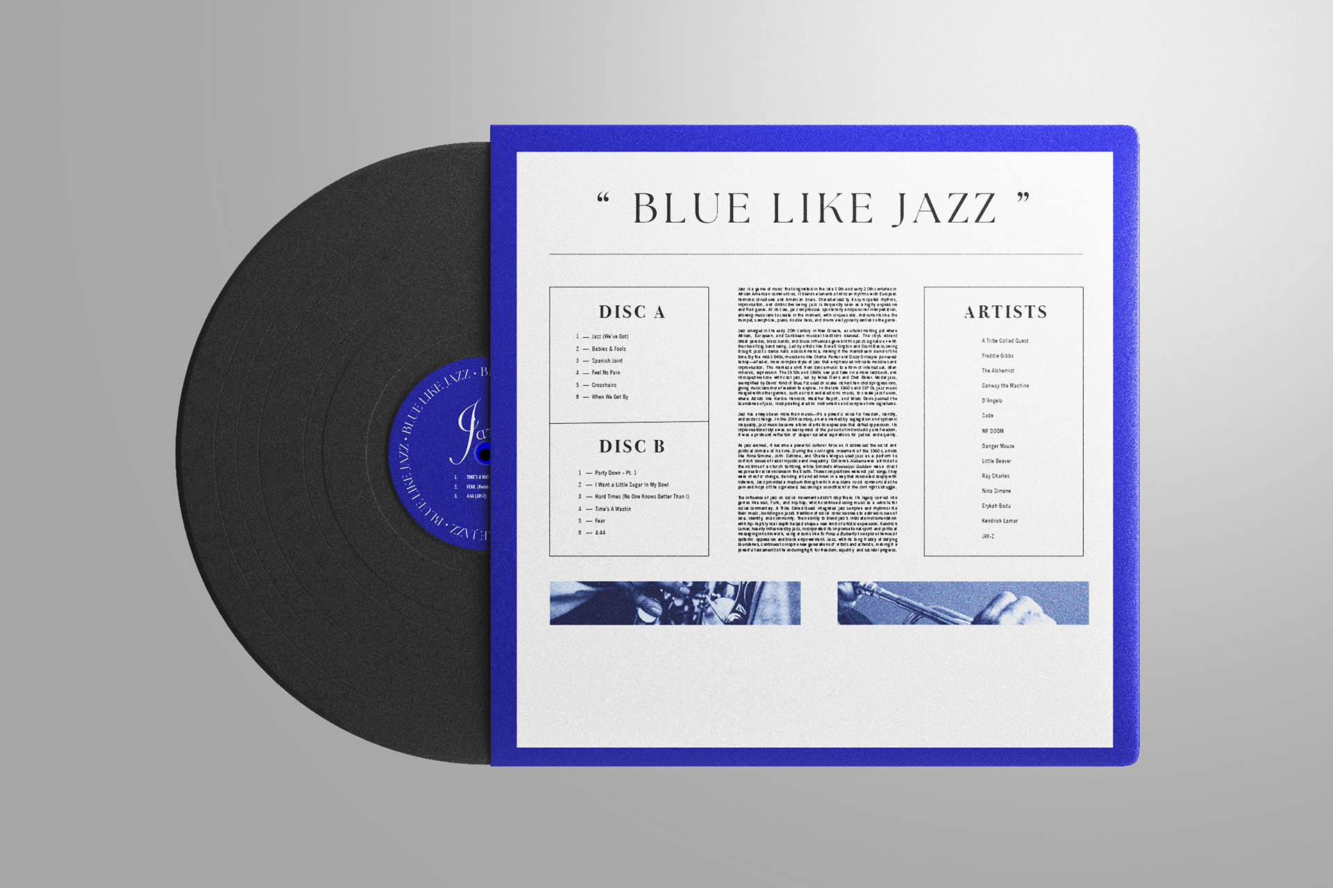 Blue Like Jazz involved creating a playlist highlighting rap and R&B tracks with jazz influences and designing a physical album package to accompany it. I designed the cover art, inserts, and vinyl to reflect the music’s themes and visually communicate the playlist’s concept.