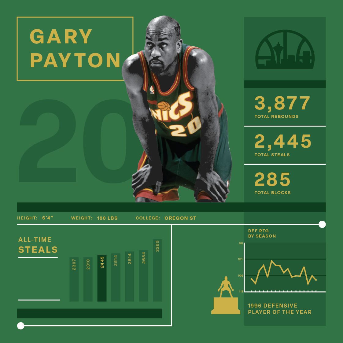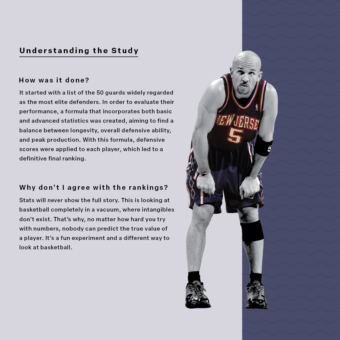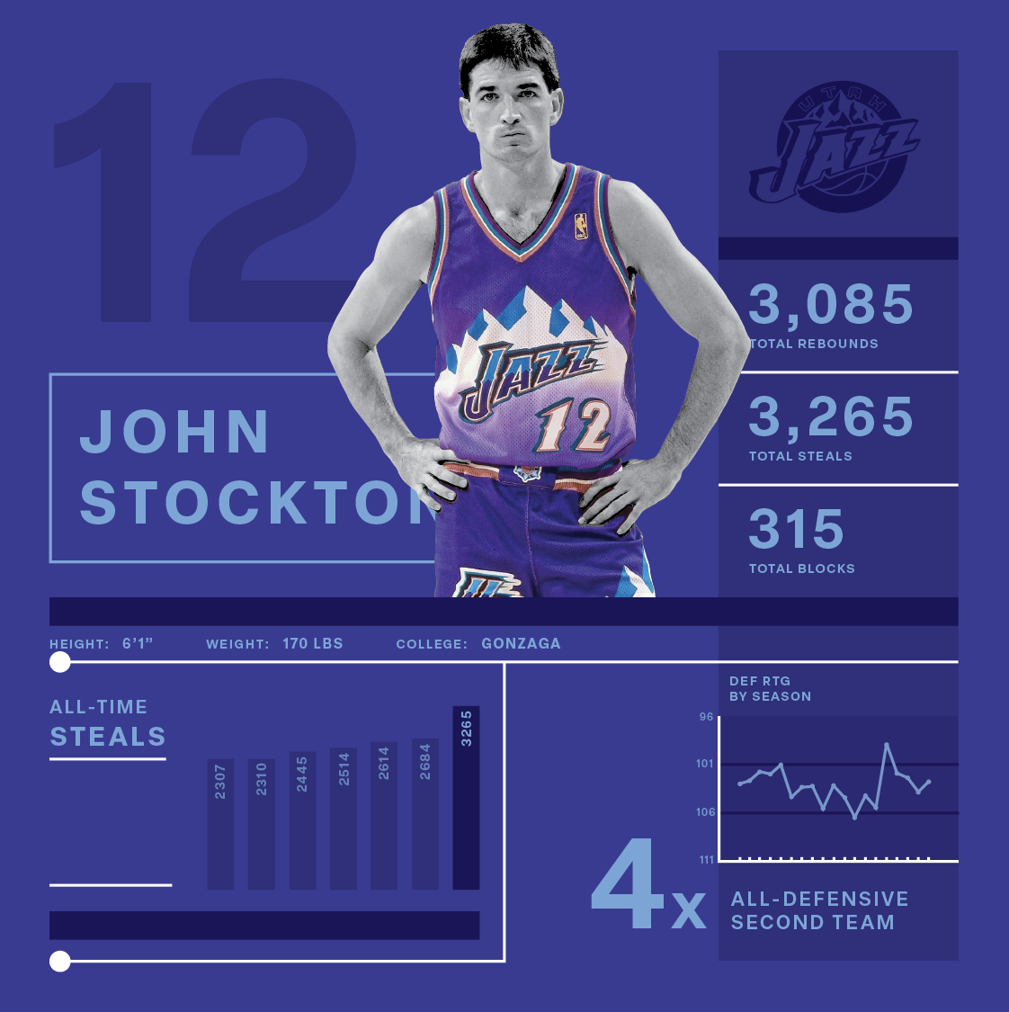 This project set out to answer a single question: Who are the greatest defensive guards in NBA history? I created a custom formula that combines multiple defensive metrics, and then designed a series of graphics to visualize the results. The outcome was an engaging, data-driven ranking that turned complex stats into clear, shareable storytelling.